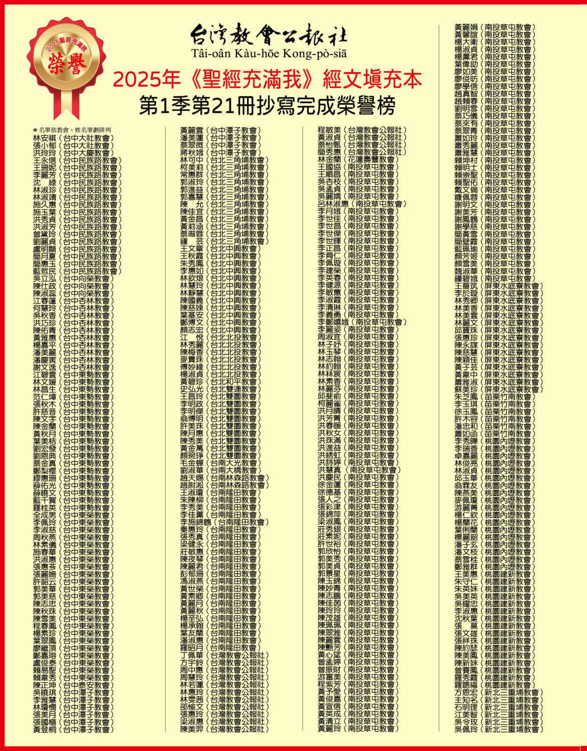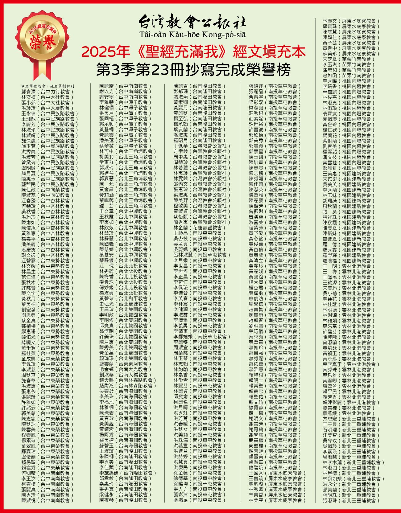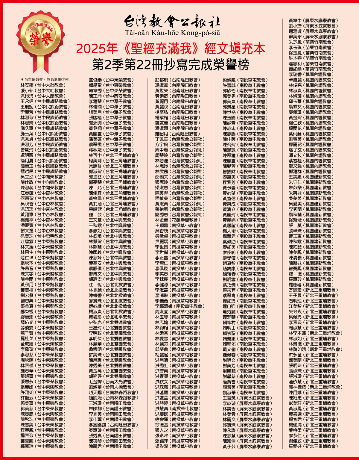 ●榮譽榜:配合《聖經充滿我》出版進度,凡抄寫完成者(每3個月1本),榮譽名單公告《台灣教會公報》以及facebook粉絲專頁。預計公告時間:4月、7月、10月、隔年1月。
