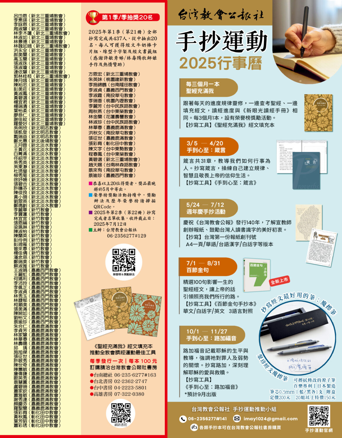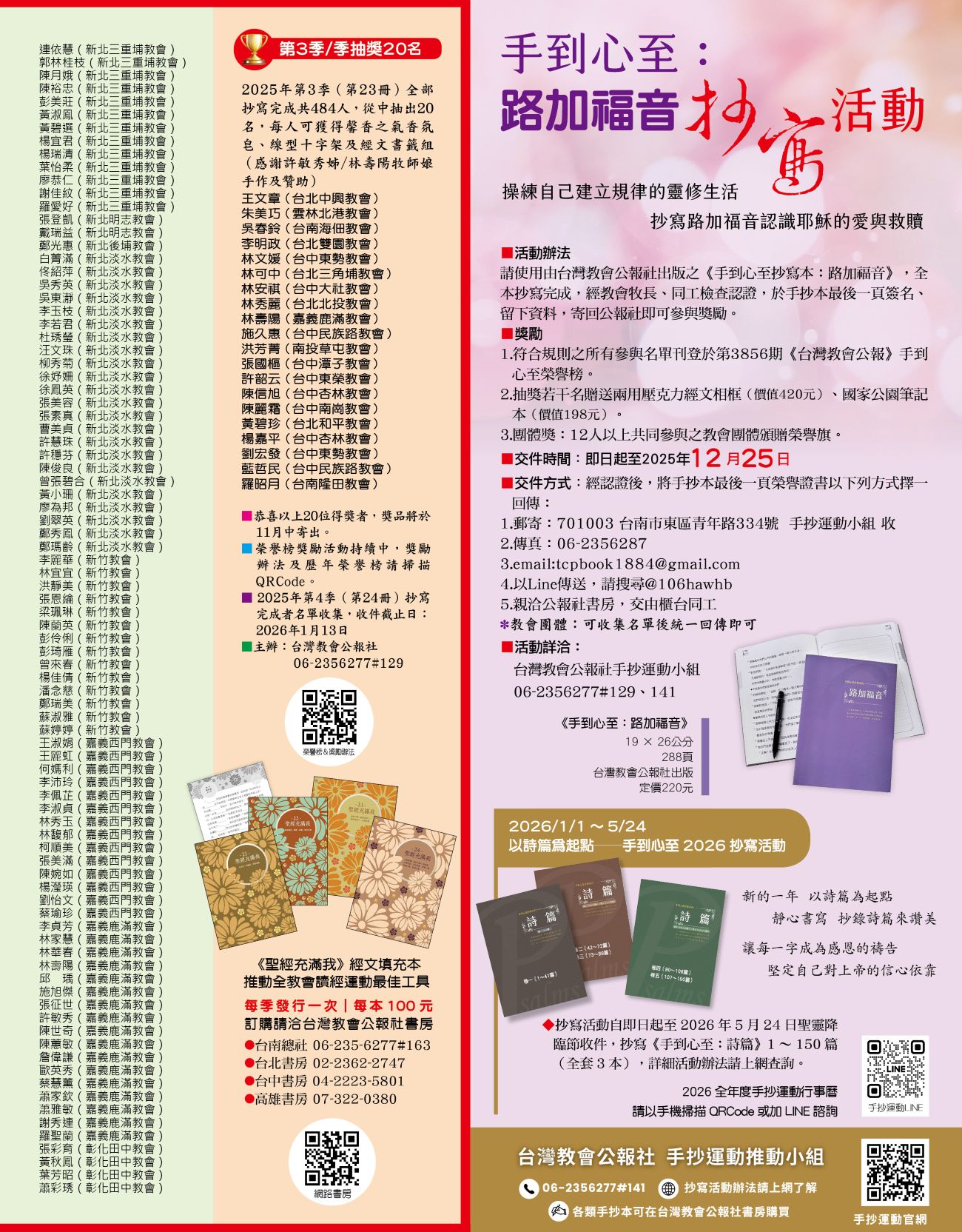 ●團體獎:教會或團體一次12人以上並全年度抄寫完成者可另外參加團體獎抽獎。