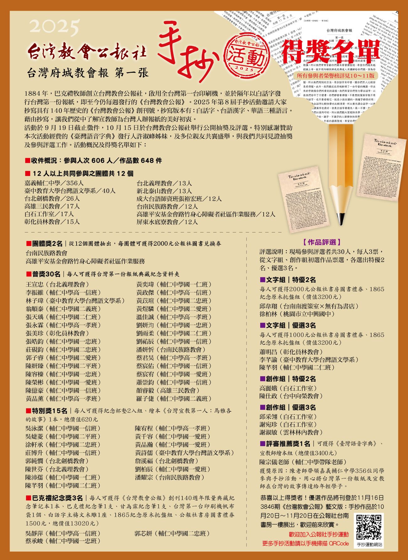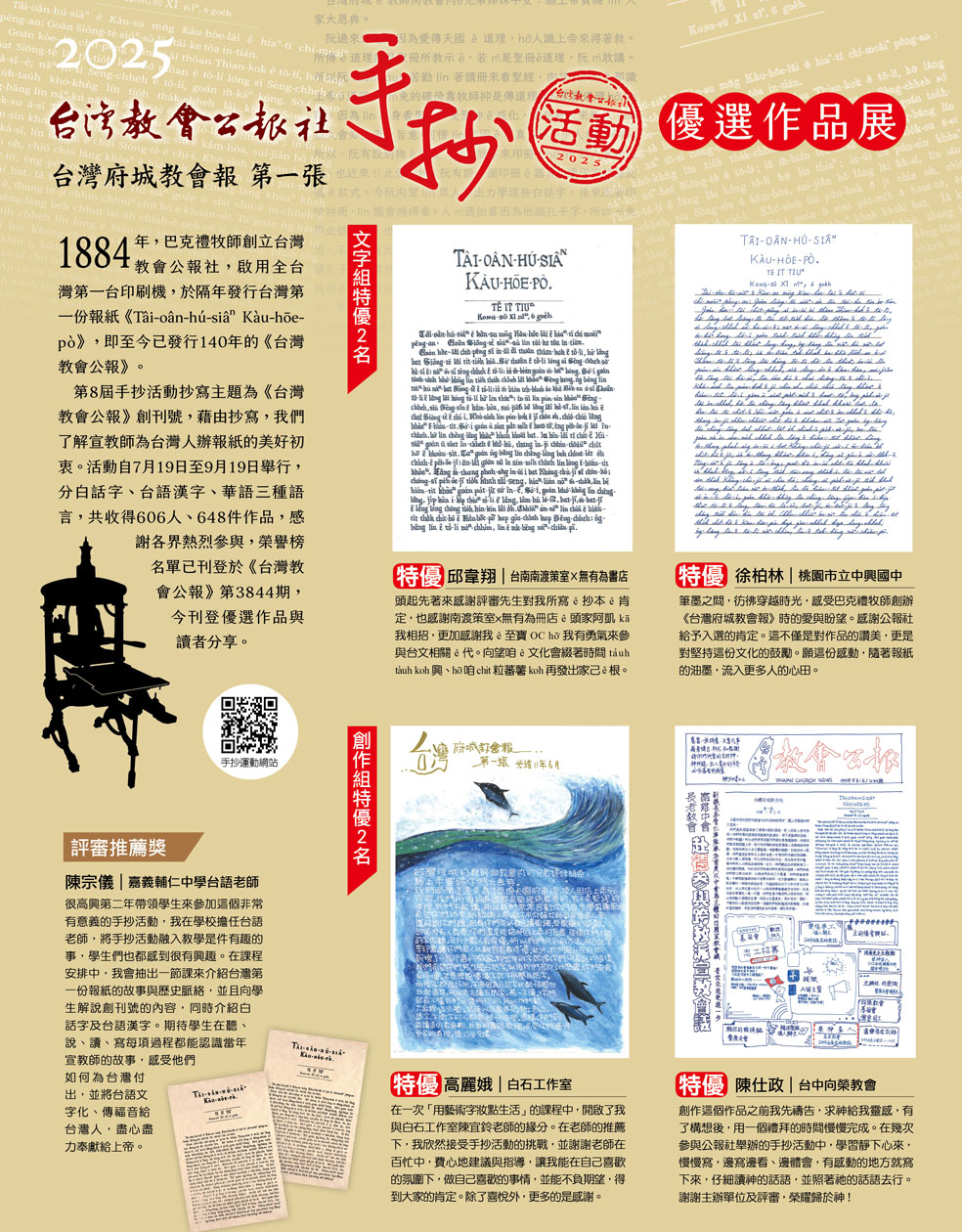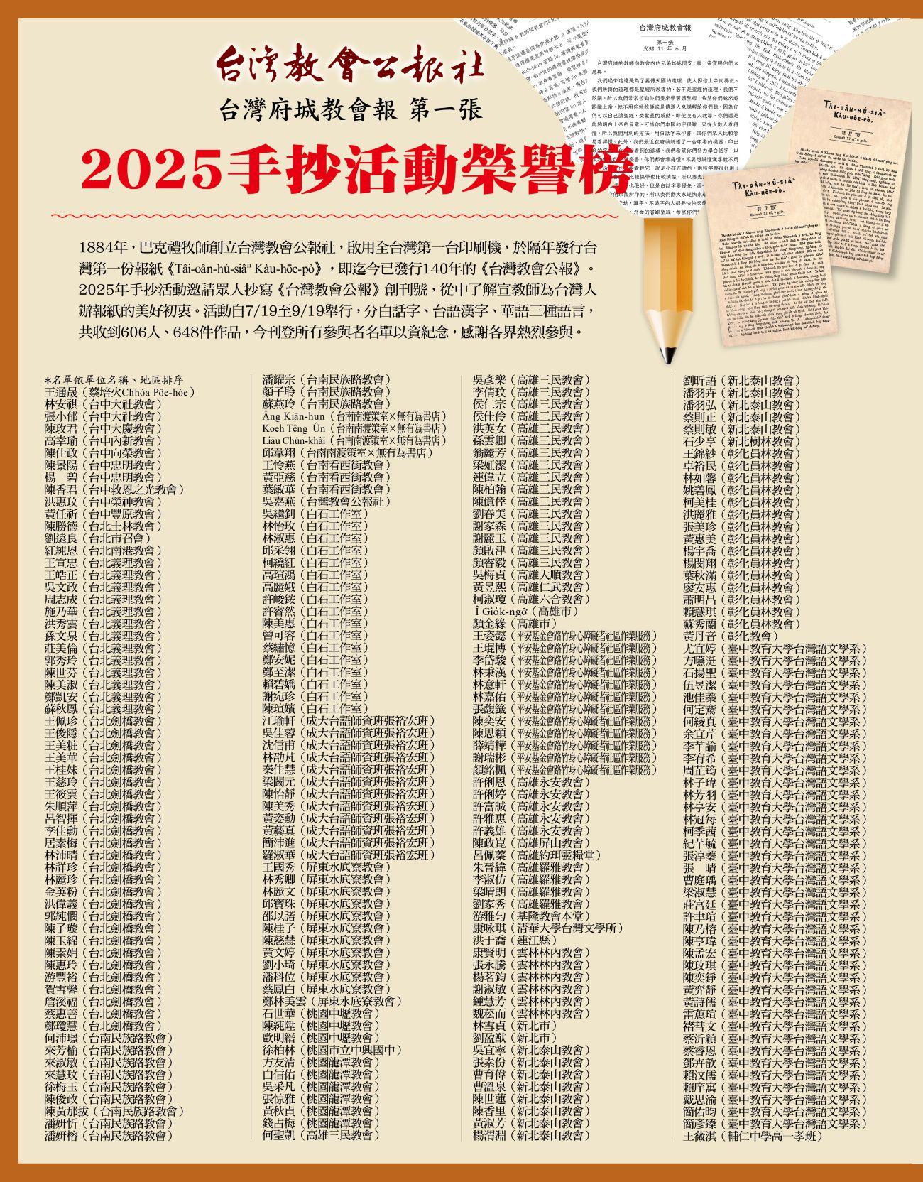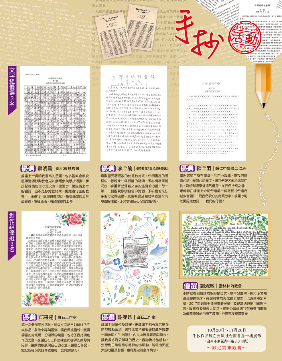 - 榮譽榜:凡參與抄寫且內容符合者,名單將刊登《台灣教會公報》以資鼓勵。
