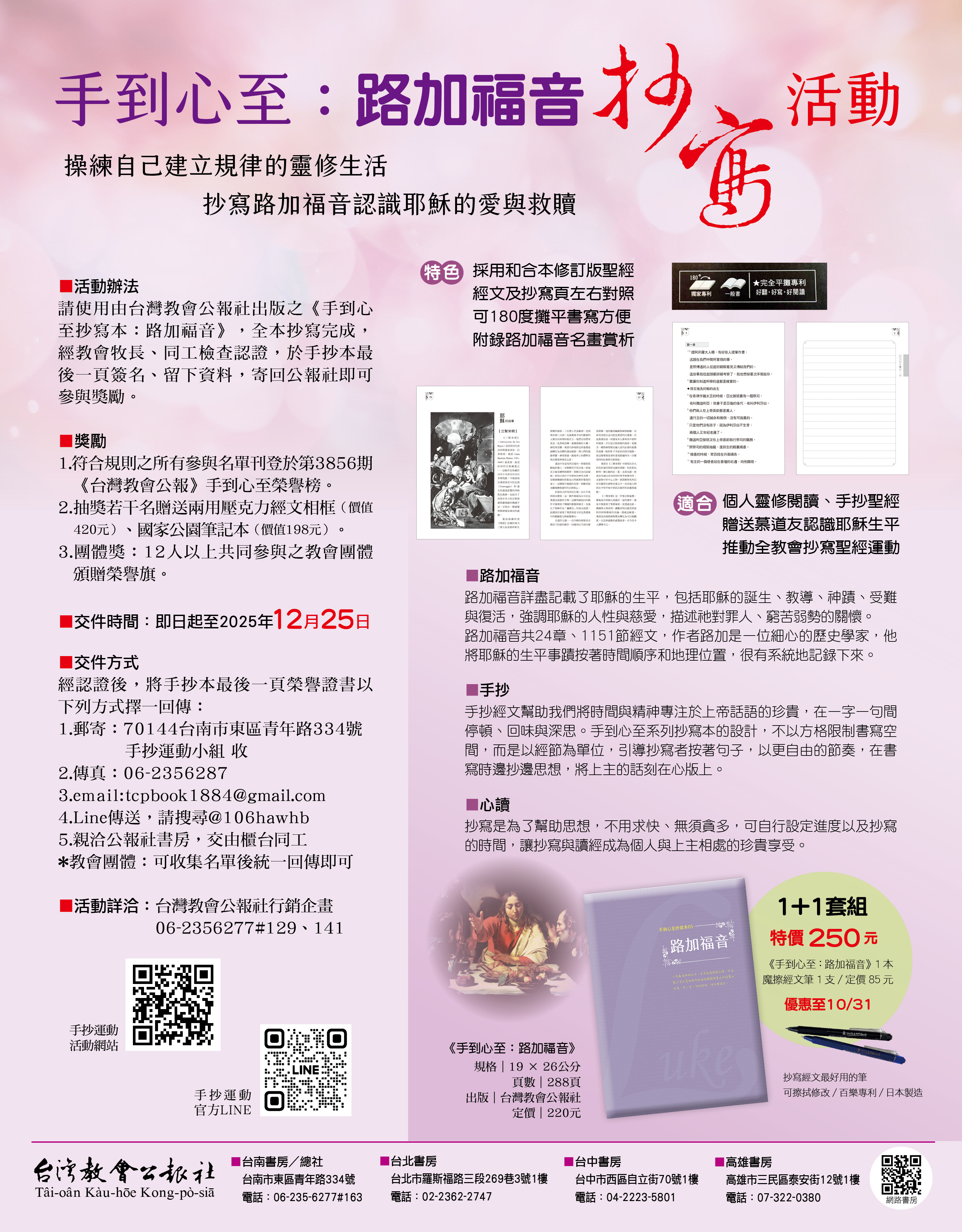 - 郵寄:70144台南市東區青年路334號/手抄運動小組 收